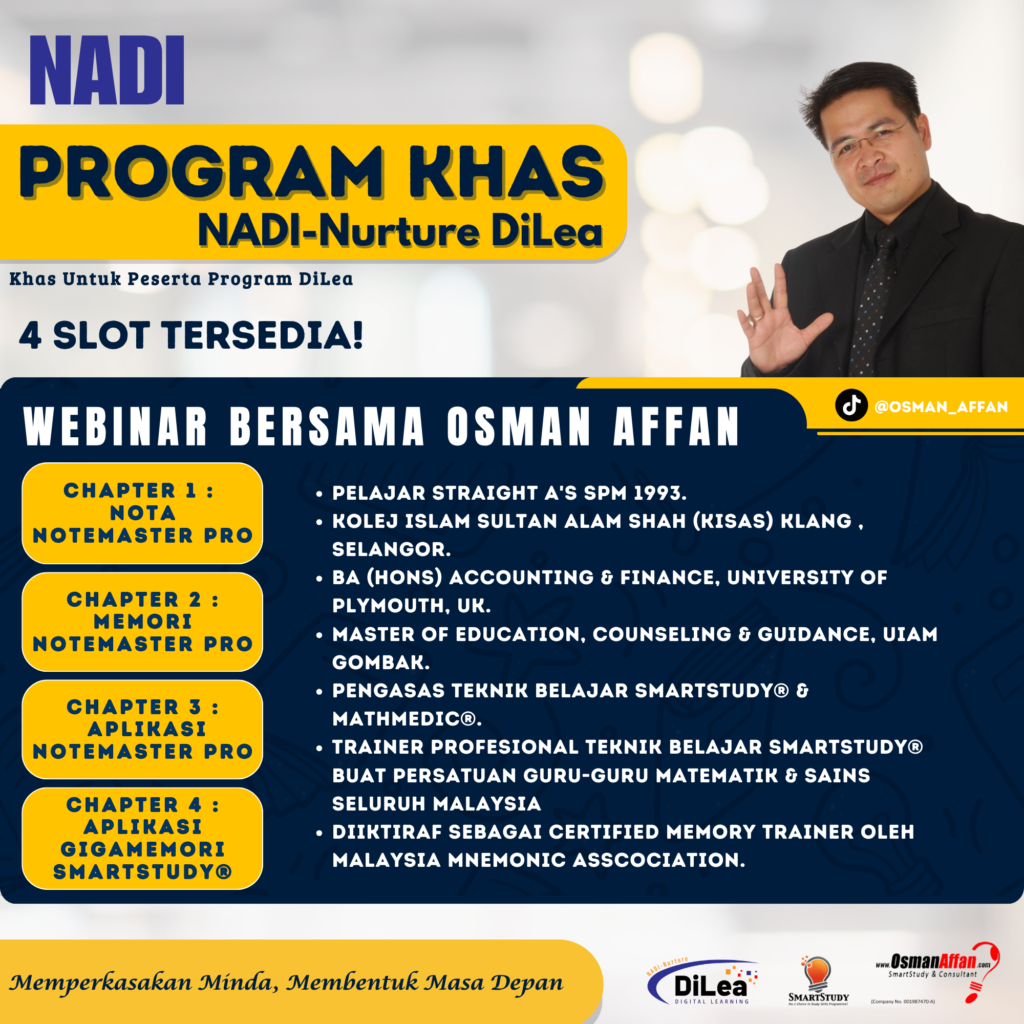 PROGRAM KHAS NADI-NUTURE DILEA Pendidikan | 17 December 2024 Program Khas DiLea ini adalah TERBUKA untuk semua pelajar tingkatan 4 sesi 2024 yang berdaftar sebagai ahli NADI